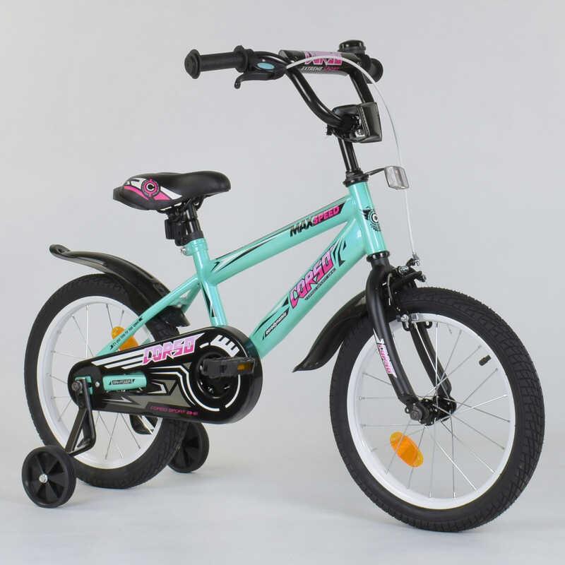 Чудовий дитячий велосипед 16 Corso MAX Speed. Рама з заниженою геометрією виготовлена из стали HI TEN з огляду на особливості молодих райдерів. Діаметр колес 16 Дюймів розрахований на ріст велосипедиста від 100 см до 115 Див. Рекомендований вік дитини 4-6 років. (Вподобається особисто). Байк Якщо у вас є додаткові страхові колеса, які перешкоджають падінню велосипеда, то це забезпечує безпеку маленького чоловіка. велосипедиста. Крихітні крила захищають від бризок води та бруду, а гучні дзвіночки попереджають про наближення велосипеда. Комфортна і сучасна геометрія рами, гарні вузли і компоненти, чудова збірка і унікальний дизайн не залишить байдужим маленького власника велосипеда. Колір: бірюзовий.